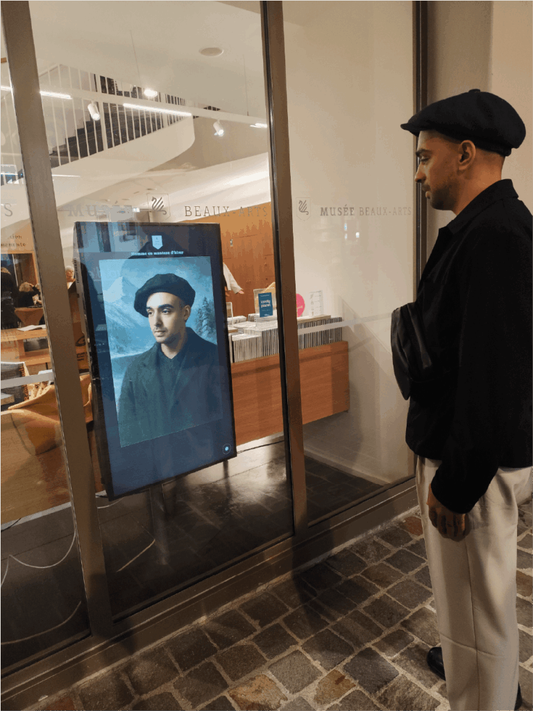 Grâce à une technologie ludique, les visiteurs choisissent l’œuvre avec laquelle ils veulent former une paire, et sélectionnent les accessoires et le décor qu’ils souhaitent voir sur leur autoportrait. Ces nouveaux tableaux sont diffusés dans la vitrine du musée, devenant à leur tour une œuvre à part entière de l’exposition.